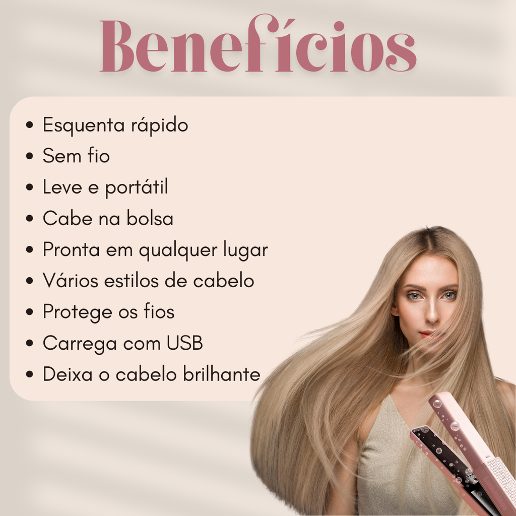 Chapinha Sem Fio Portátil GlamHair – Alisador de Cabelo Recarregável com Placas de Cerâmica